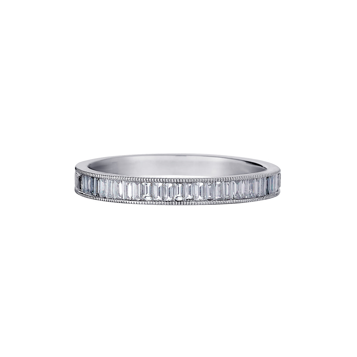 This elegant baguette diamond band features a row of sleek, elongated baguette-cut diamonds set in polished 18kt white gold for a modern take on classic elegance. Whether worn alone or stacked, it offers timeless sparkle and sophisticated style for any occasion.
